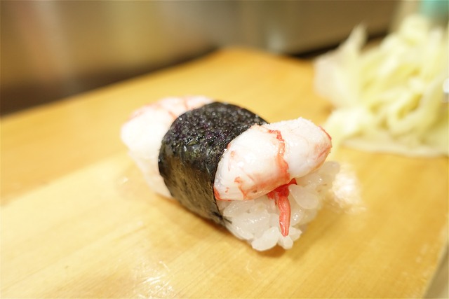 Nigiri sushi detail: Stout red shrimp (Hikarichihiroebi) Nigiri sushi
